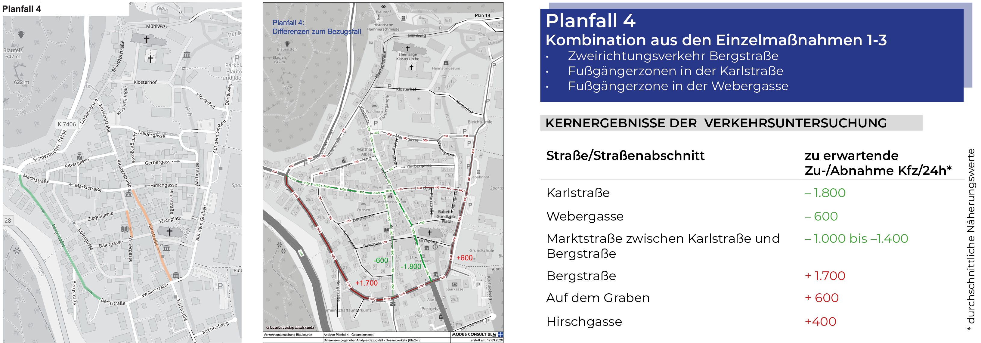Im Planfall 4 werden die in den Planungsfällen 1 bis 3 untersuchten Maßnahmen gemeinsam unterstellt und verkehrlich bewertet. Es wird also sowohl ein Zweirichtungsverkehr in der Bergstraße angenommen als auch die Einrichtung von Fußgängerzonen in Karlstraße und Webergasse.